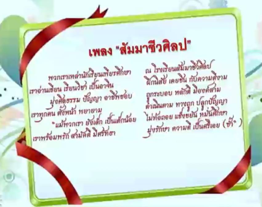 ดาวน์โหลด เพลงประจำโรงเรียนสัมมาชีวศิลป ขอแสดงความยินดี แด่ นักเรียนที่นำชื่อเสียงมาสูโรงเรียน ฯ เด็กหญิงนัยรัตน์ อารีประยูรกิจ เด็กหญิงบัณฑิตา ดาวพราย |